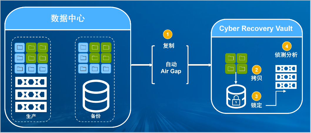 PA视讯国际 PA国际防勒索病毒方案将生产中心备份数据复制到Vault区,复制后网络自动断开实现弹性隔离。Vault区的数据快速拷贝,并对拷贝版本加锁(在锁定期数据不允许删除和修改)。Vault沙箱内对拷贝版本进行扫描分析,验证数据是否完好。